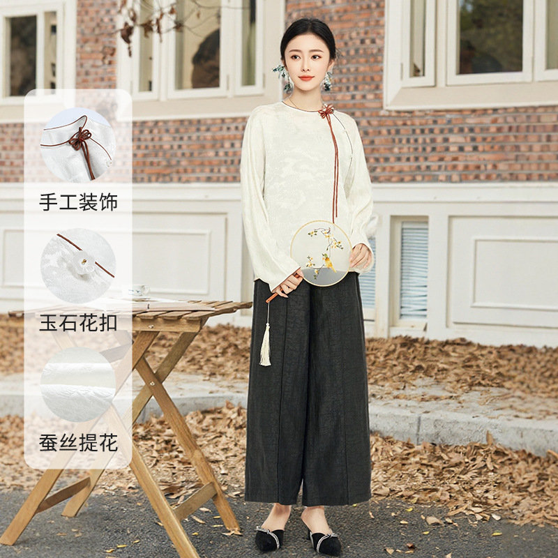 夏の新作、新中式風トップス、女性用桑蚕糸香雲紗、レトロな長袖、ラウンドネック、おしゃれで万能なTシャツ