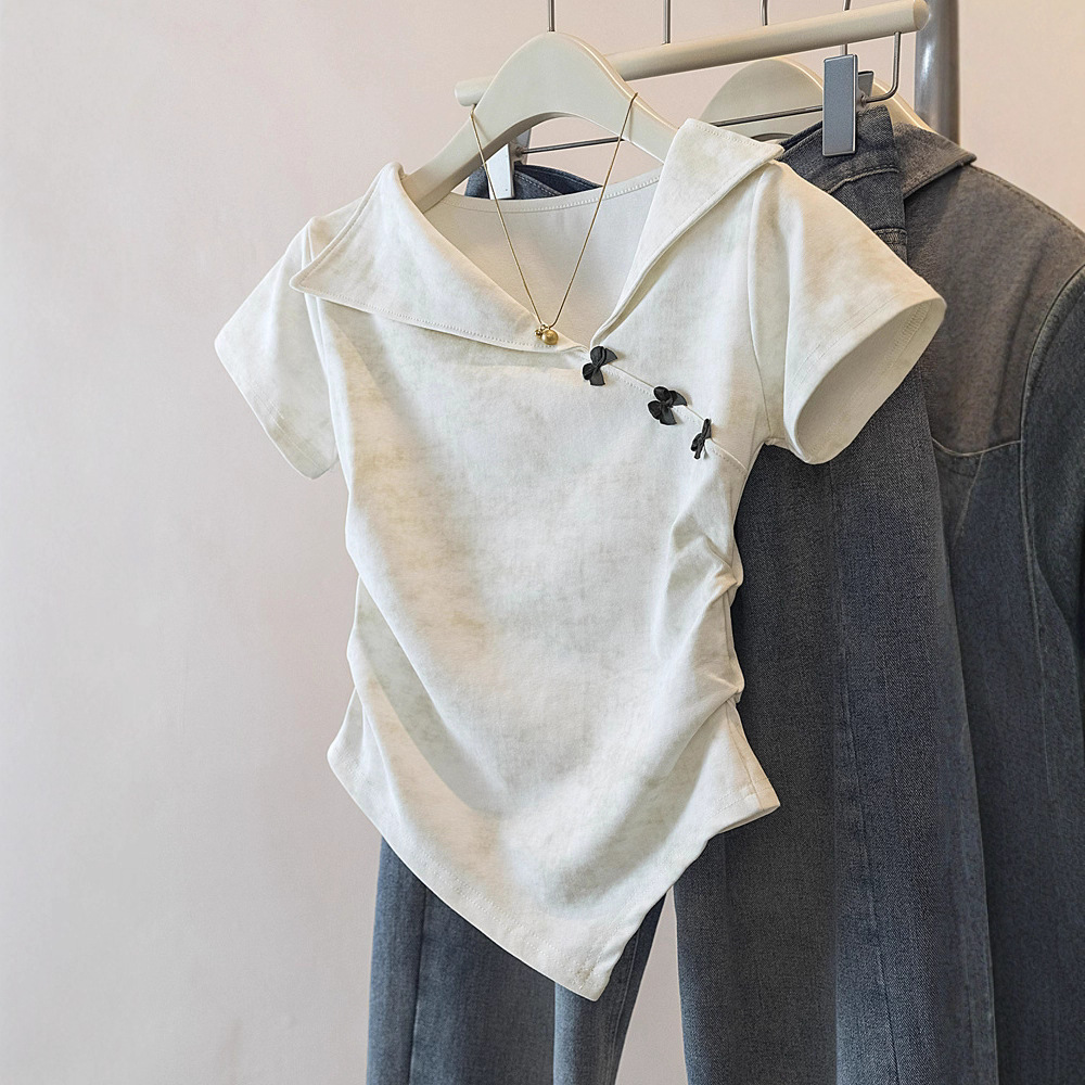 新しい中国式のバックルの国風の上着の春のデザイン感のレトロな肩の半袖のtシャツの女性の夏は上着の女性を染めます。