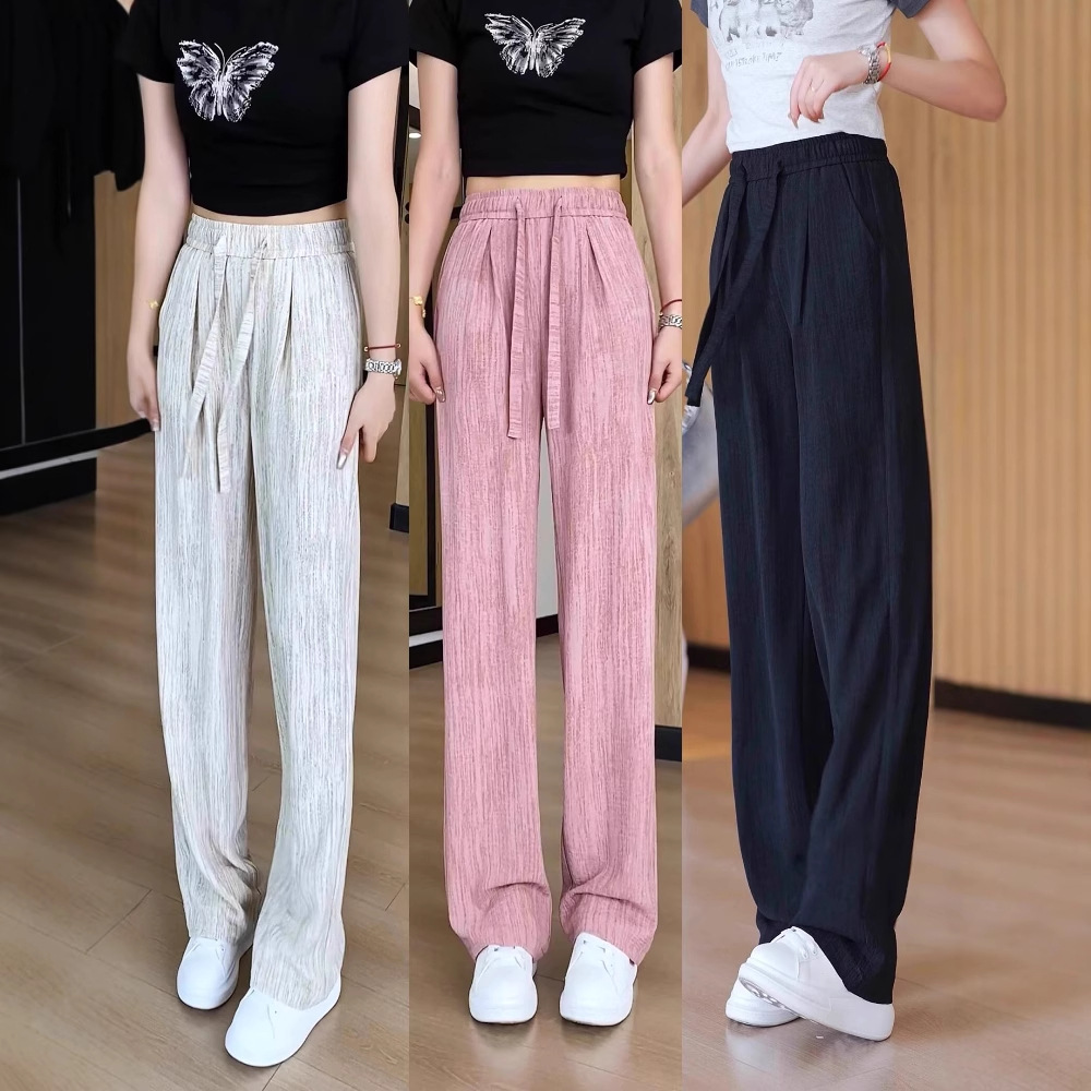女性用テンセルコットンとリネンのワイドレッグパンツ、夏用の薄いハイウエストドレープリネンホワイトアイスシルクストレートレッグレイジーフロアモップパンツ