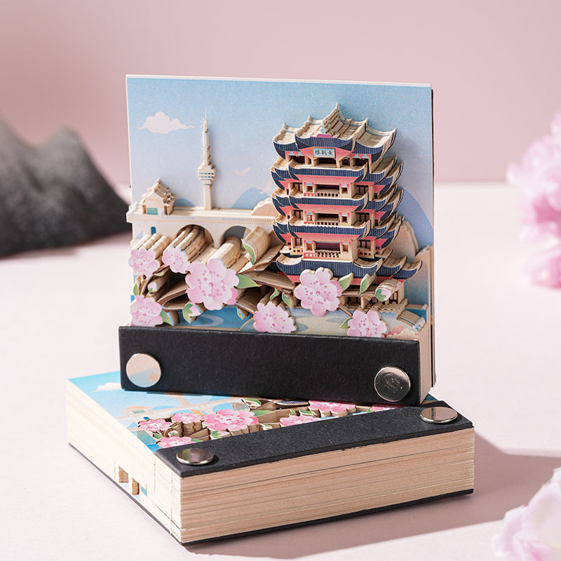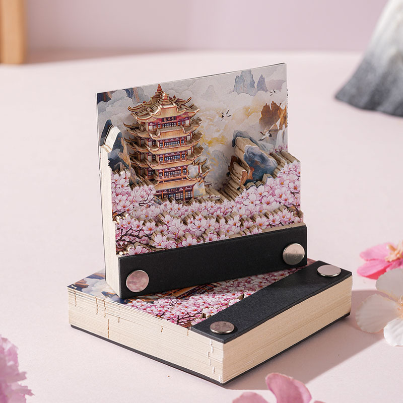 3Dプリント彫刻 桜韻黄鶴楼 立体ノートブック アートワーク 手で切れる高価値付箋 非粘着卓上カレンダー