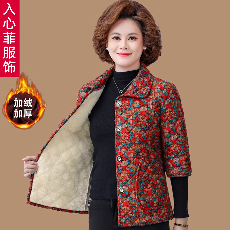 お母さんの綿入れ服、中高年女性用裏起毛綿ジャケット、秋冬用厚手おばあちゃん向け花柄コート、屋台のお母さん向けモデル