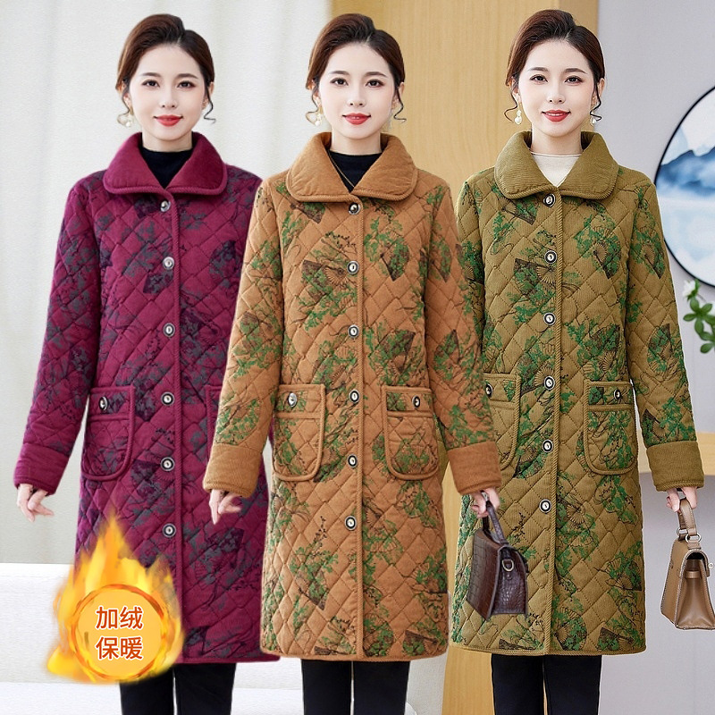 2025秋冬レトロ大きいサイズ中綿入り厚手コート女性中高年ママ服花柄綿入れジャケット