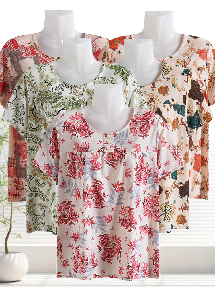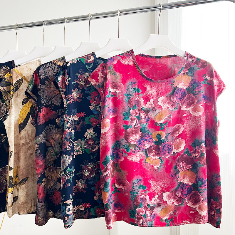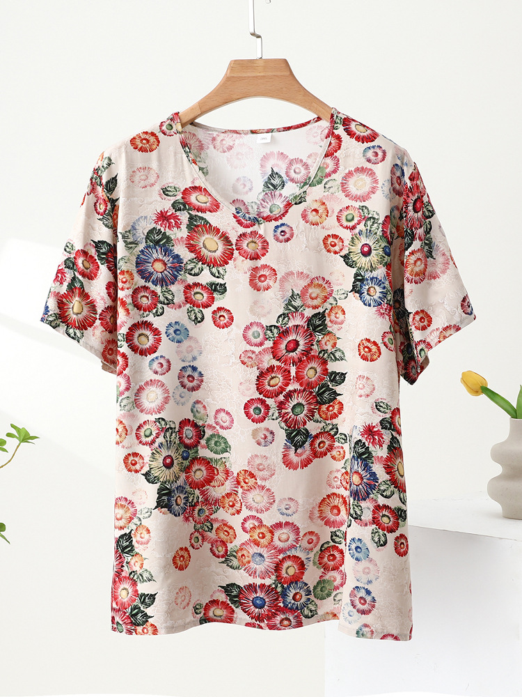 ママの綿シルクトップ女性の夏ルーズプルオーバー V ネック Tシャツ薄いカジュアル花柄中高年綿半袖