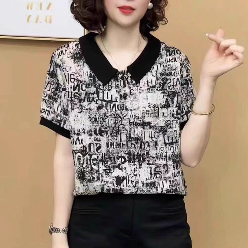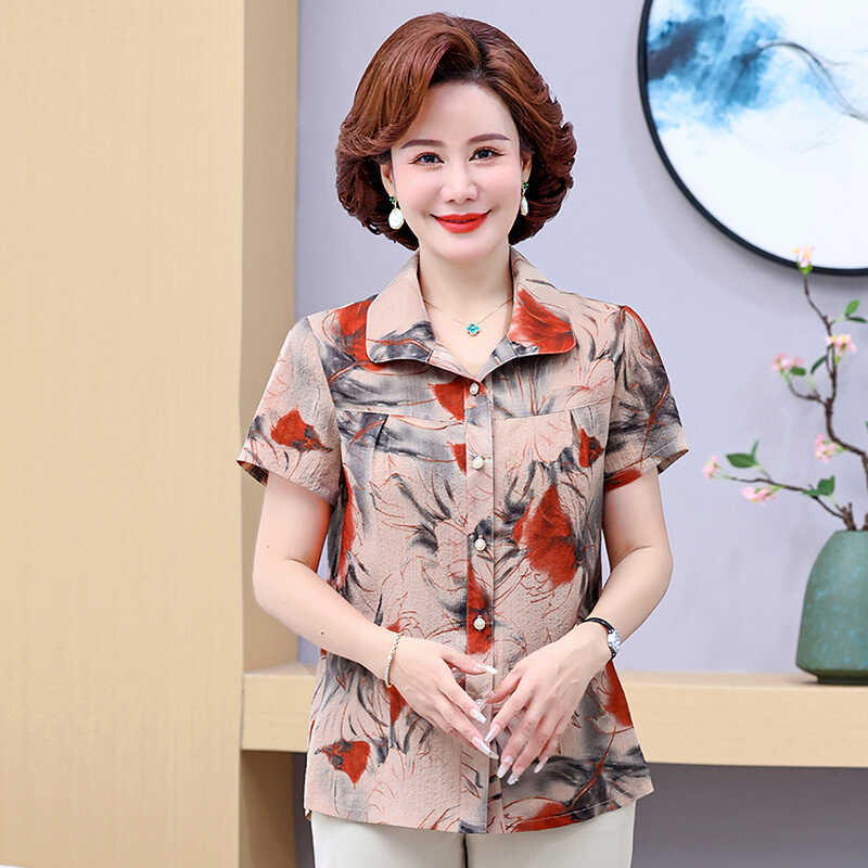 ママの夏半袖シャツ、襟付き水墨画トップス、おばあちゃんの夏スーツ、中高年の夏服