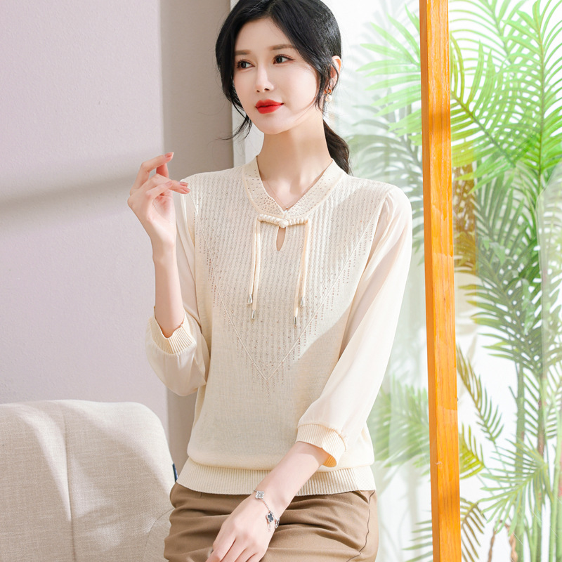 お母さんの春と秋のファッションのウールの底のシャツの中年の婦人服の2025新型のセーターの中で老年の春の服のニットの上着