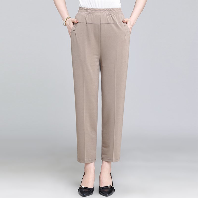 中高年女性の夏用薄手マザーズパンツ、高齢者用ストレートハイウエスト伸縮性ウエストゴムカジュアルパンツ