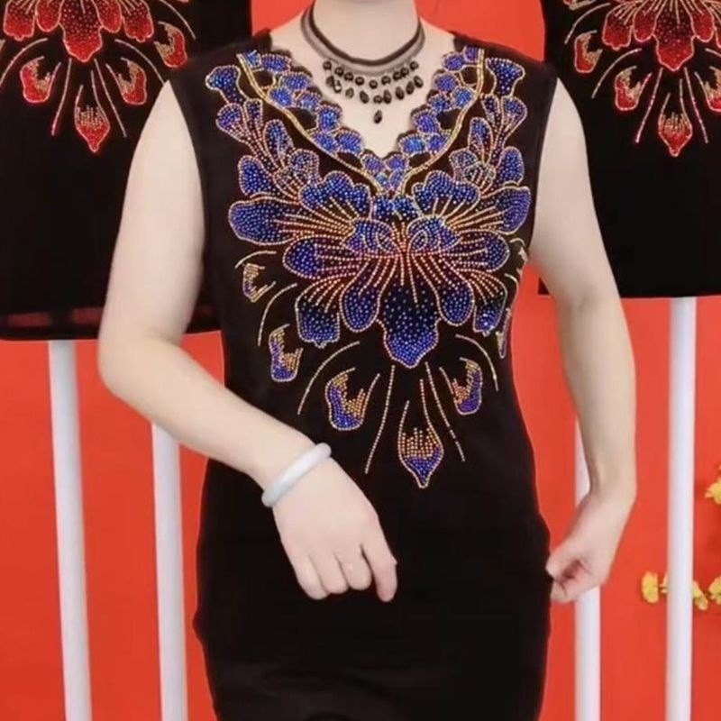 ファッショナブルなホットダイヤモンドプリント半袖Tシャツ女性用2024夏の新しいスタイルのゆったりとしたスリムで多用途なママトップ