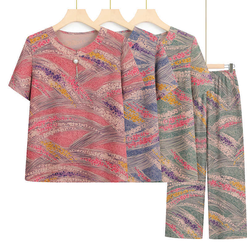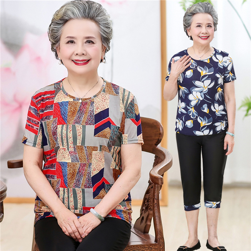 老婦人アイスシルクスーツ70-80歳おばあちゃんルーズトップ夏ツーピースセット中高年女性半袖Tシャツ