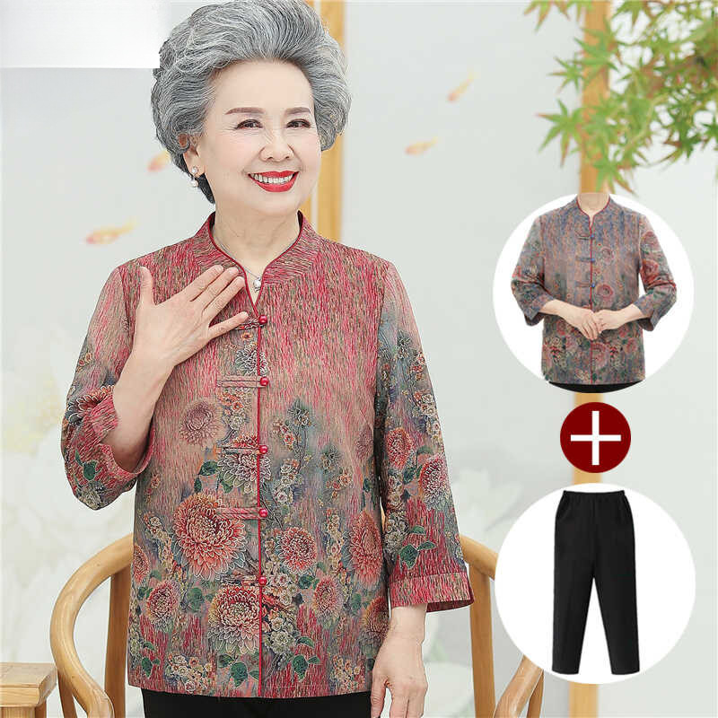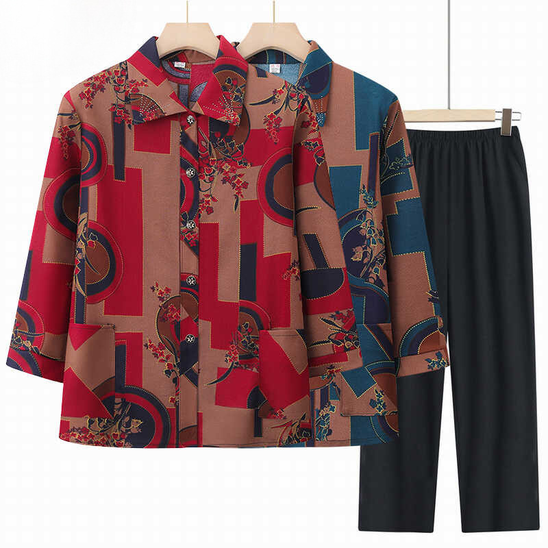 中高年ママ服、夏用長袖シャツ、おばあちゃんツーピースセット、高齢者服、女性ゆったり妻カーディガンスーツ