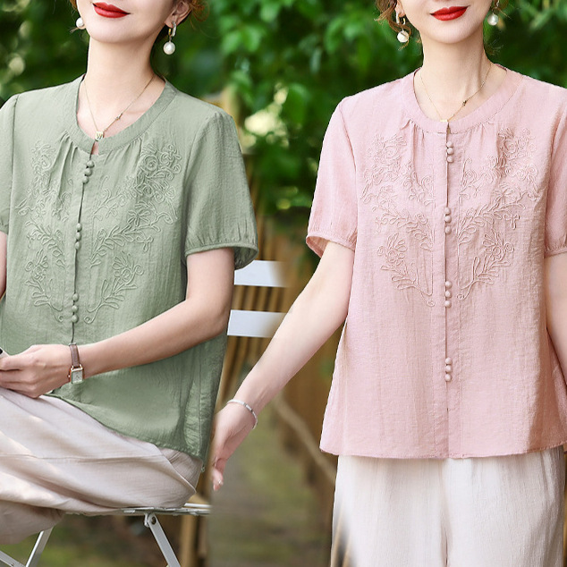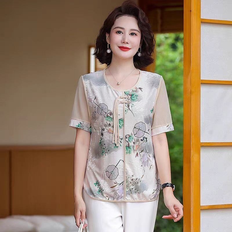 ママの夏シャツ、半袖シャツ、中高年女性の新しい中国風立体スタイルルーズトップ刺繍なし