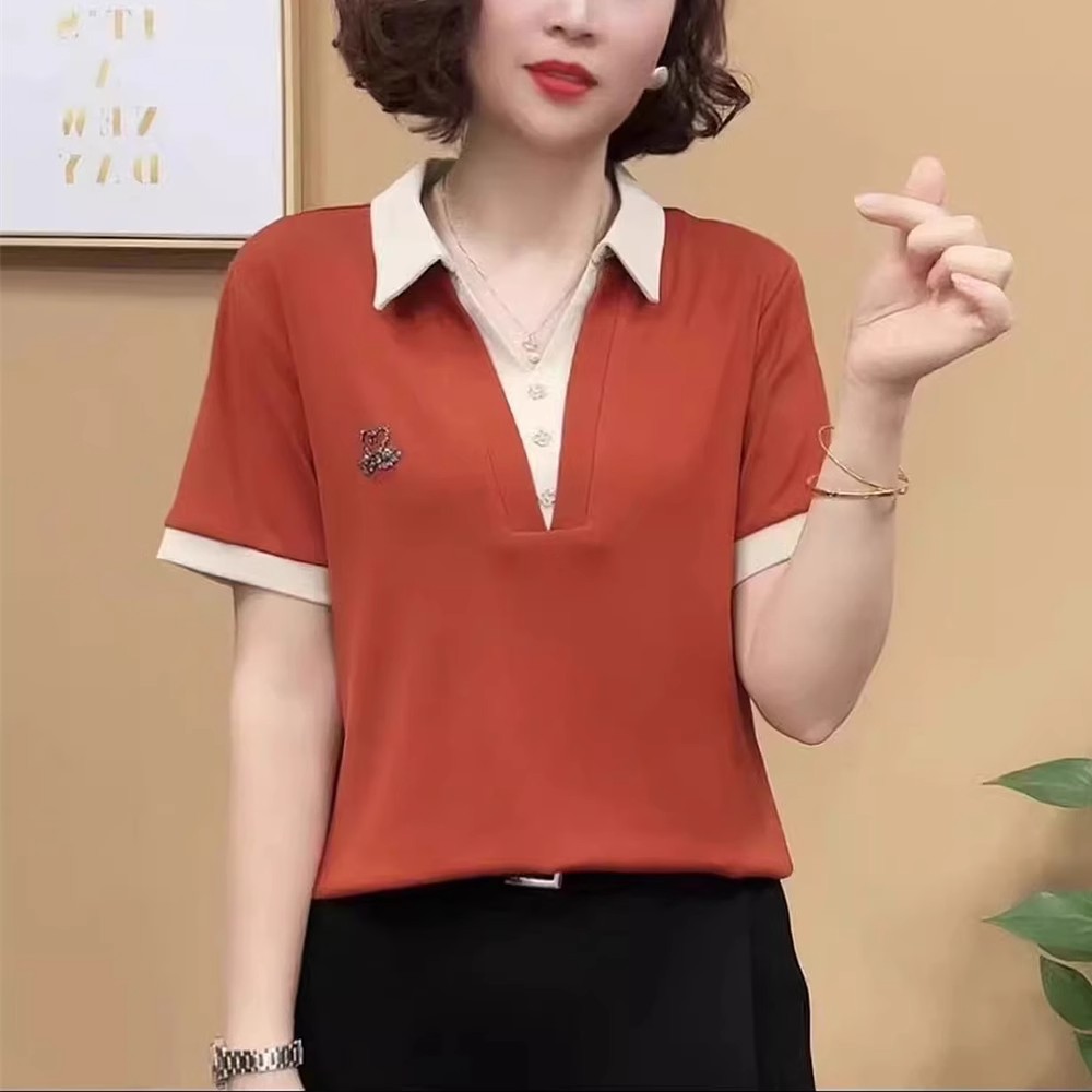 新しい夏中年女性のラペルコントラストカラーホットダイヤモンド白鳥半袖無地 3 つボタンファッショナブルな気質ママ T シャツ