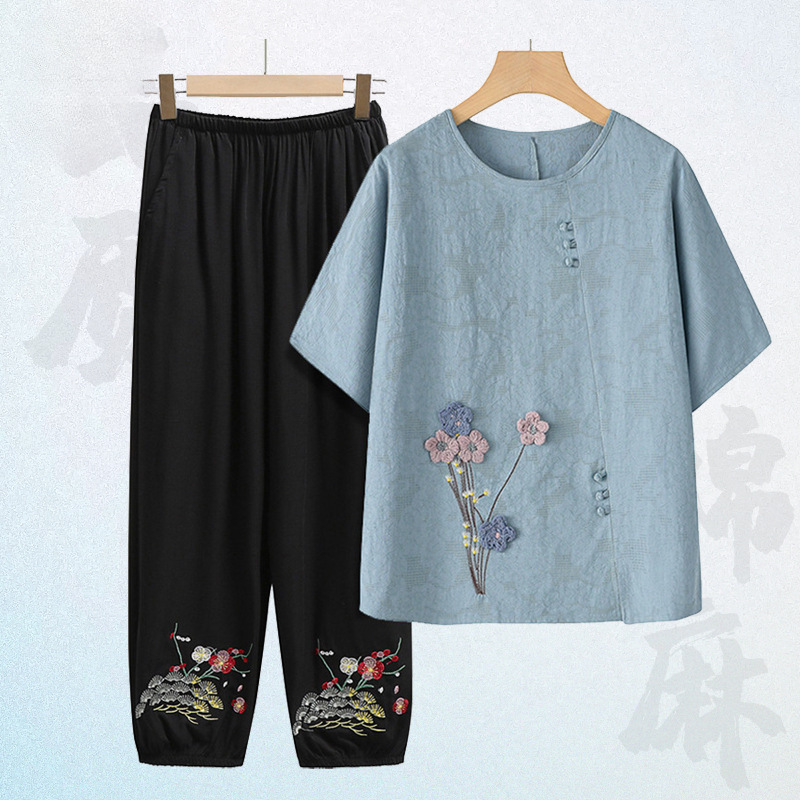 中高年女性の夏用半袖スーツ、綿絽カーディガン、Tシャツ、9点パンツ、母親服、高齢者おばさんスーツ