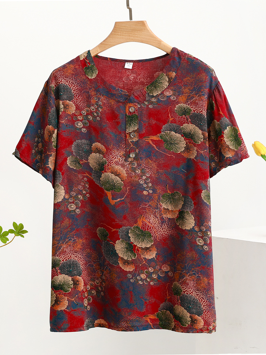 綿シルク Tシャツ女性母親夏薄いエスニックスタイルボタン半袖新中国風中高年人工綿トップ