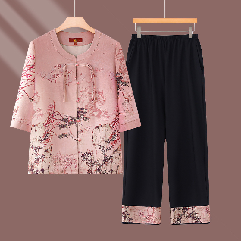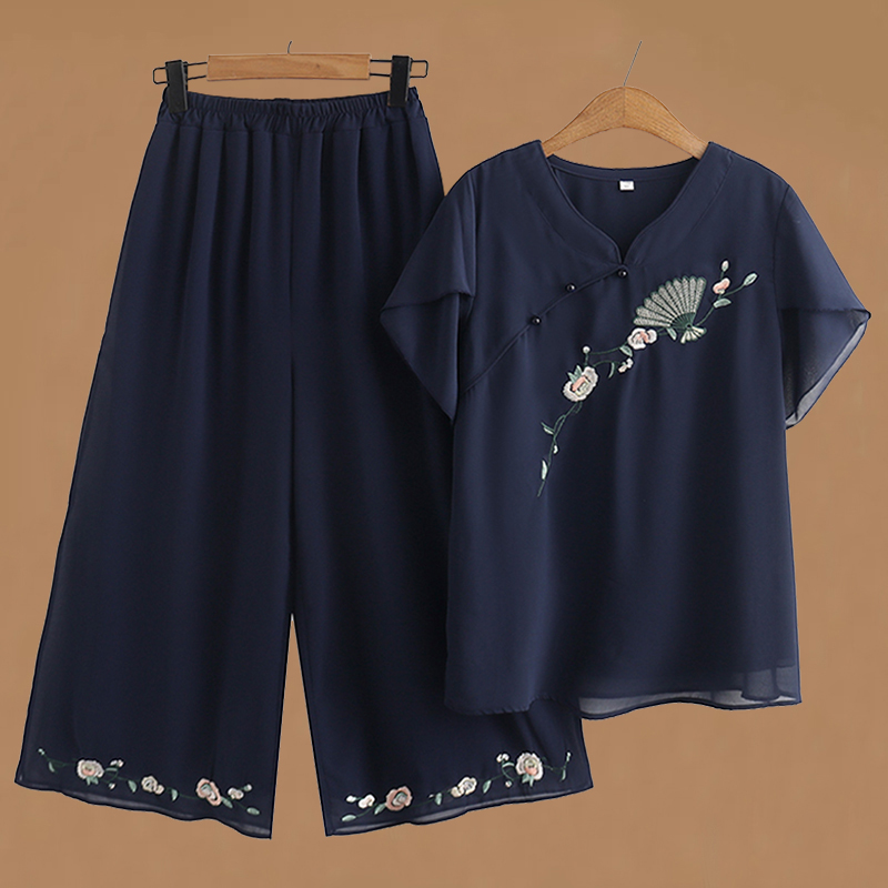 新しい中国風ママ夏半袖シフォンスーツ中高年女性の夏の中国風トップス 2 点セット母の日