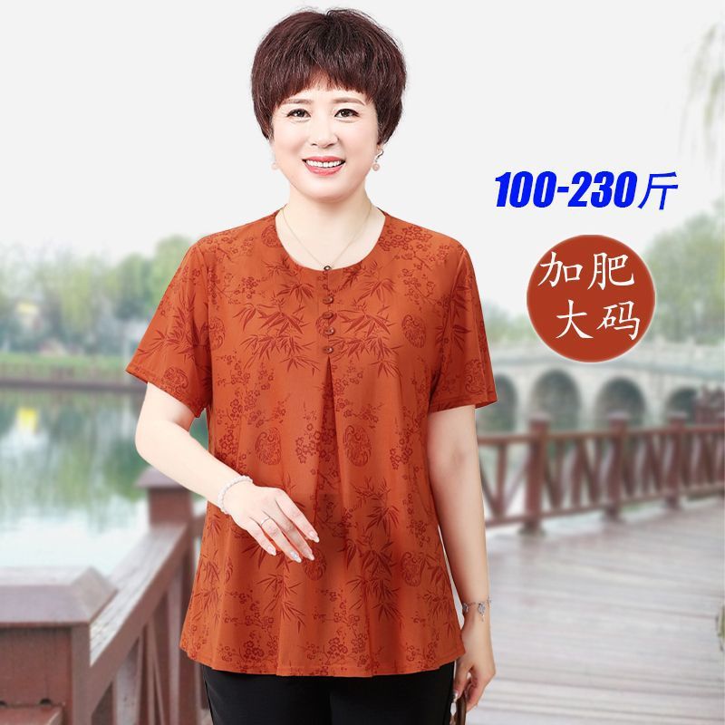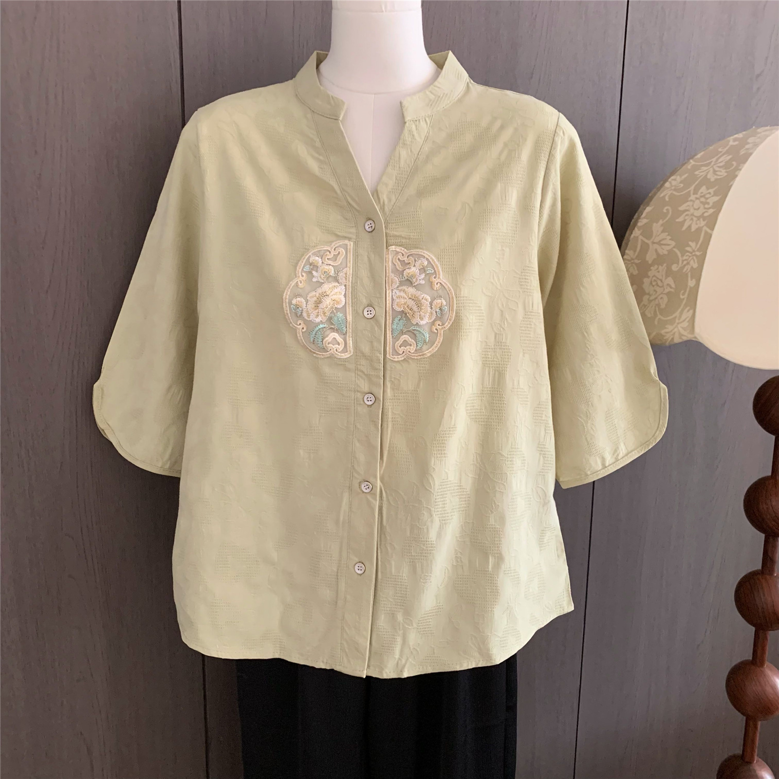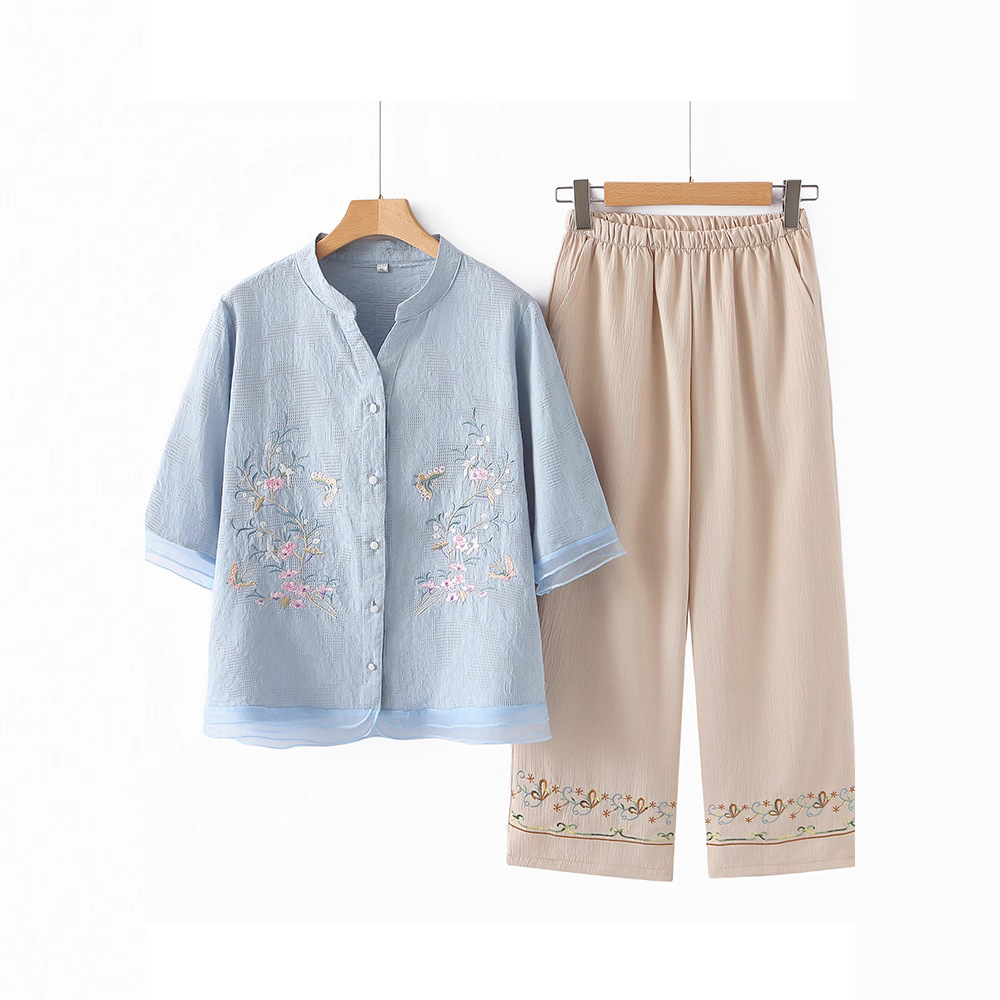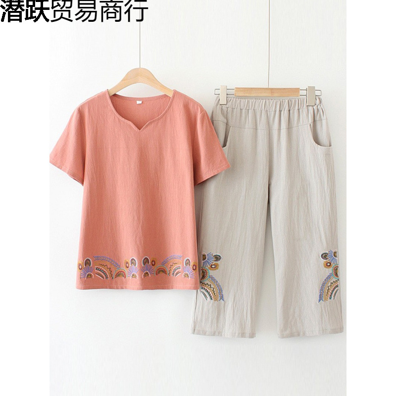 夏ママ半袖ツーピーススーツ中年女性大きいサイズ綿刺繍ファッションシャツ中高年スタイルトップス