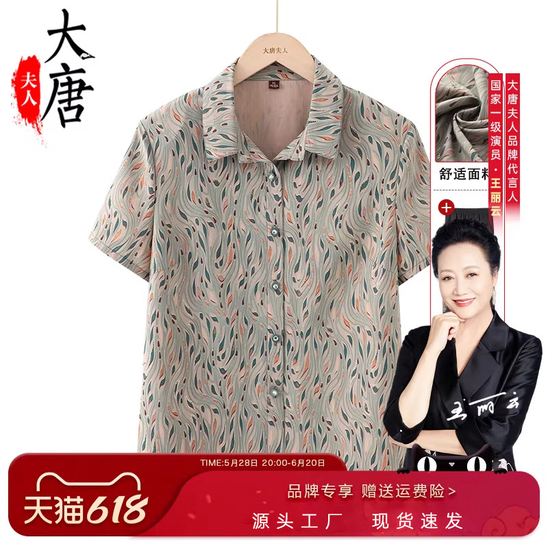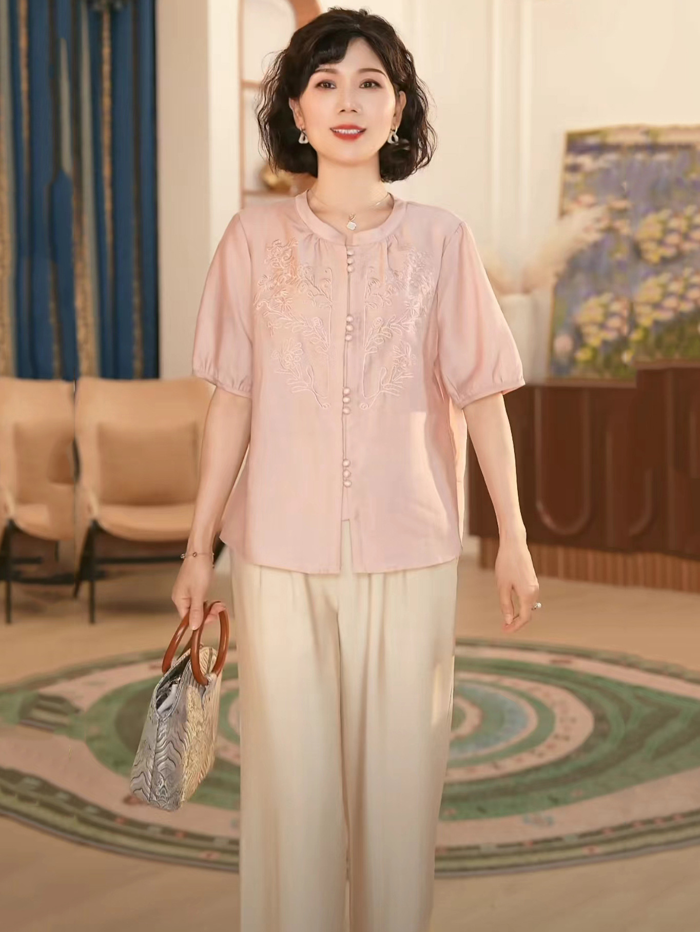 高級新中華風ママ夏半袖トップス2025新作小さめシャツ、中高年女性向けのゆったりとしたスーツ