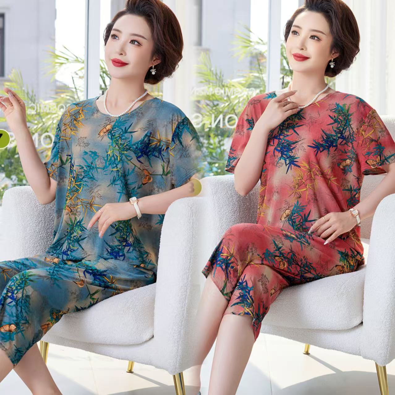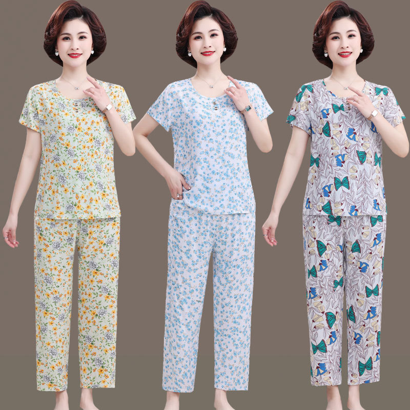 中高年女性の夏綿シルクパジャマセット、ゆったりとした9点パンツ、母親の半袖人工綿トップス、ホーム服