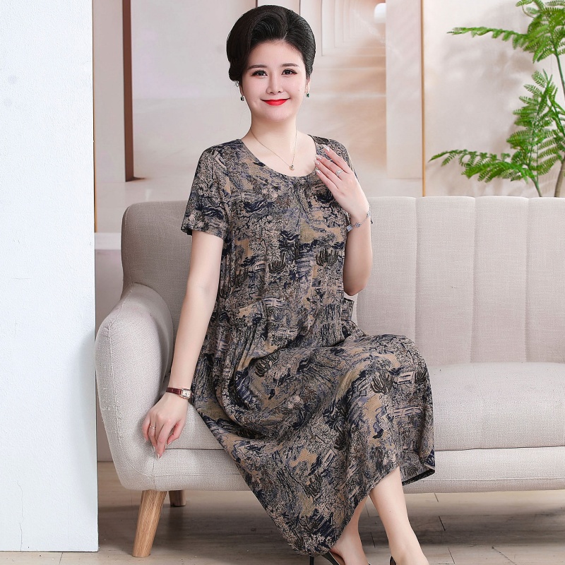 ファットママドレス夏ルーズお腹カバー 100kg 中高年大きいサイズ婦人服花柄コットンシルク半袖スカート