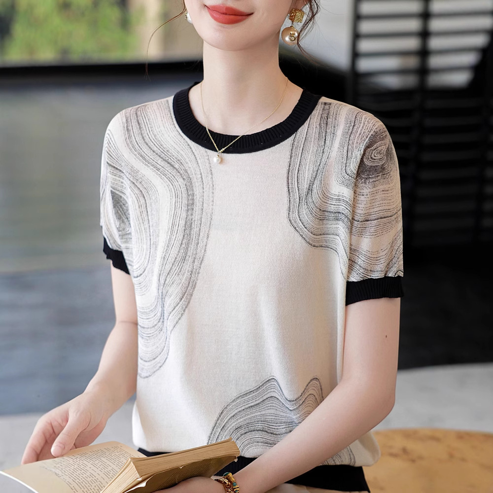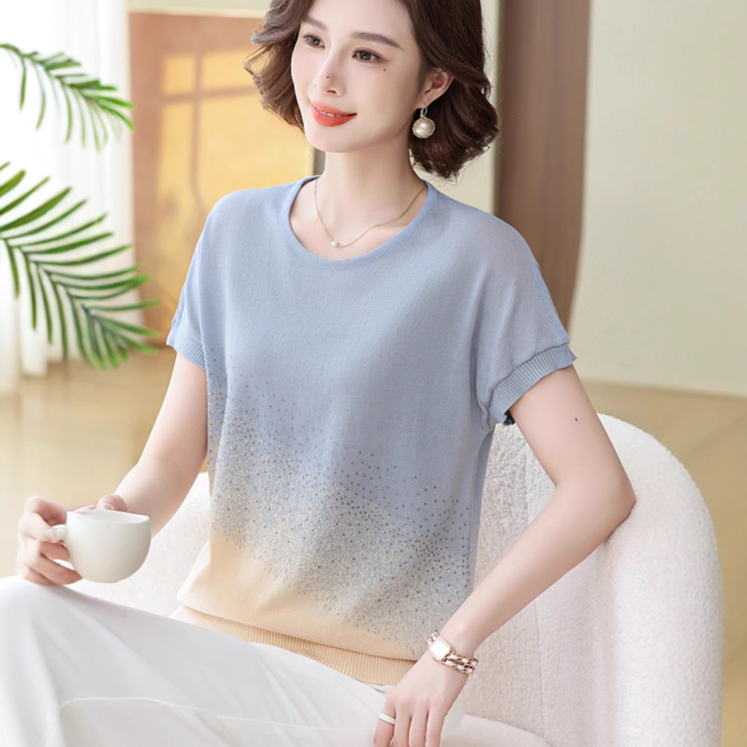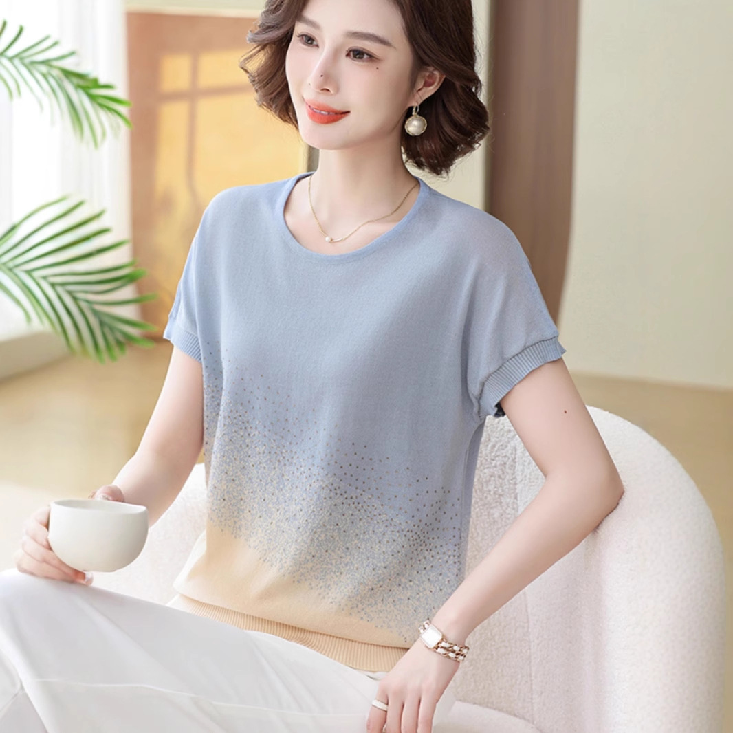 2025 外国風中高年女性のアイスシルクボトムシャツ夏半袖Tシャツママルーズニット薄手トップ