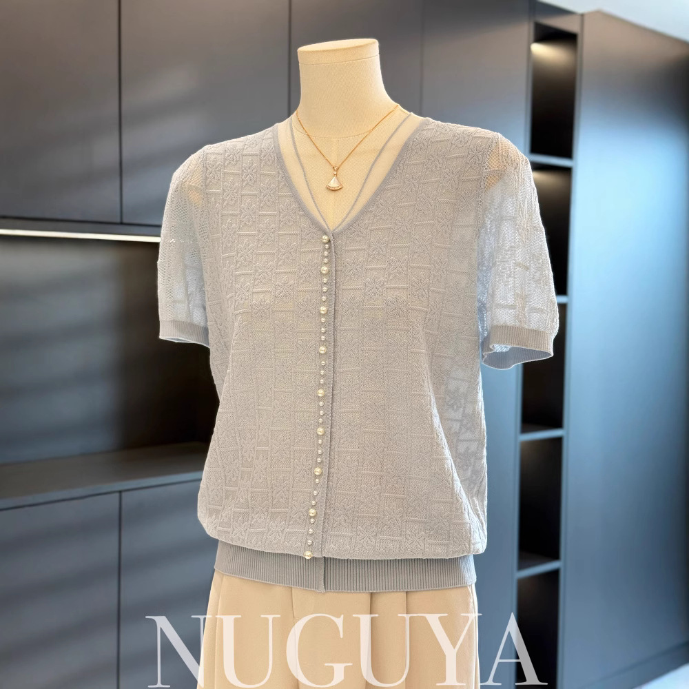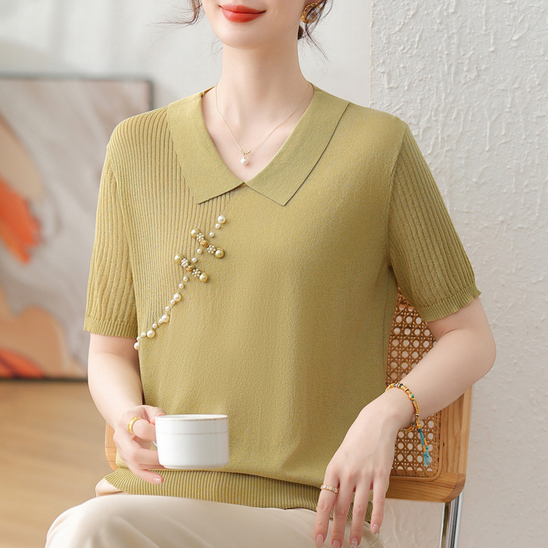 おしゃれでスタイリッシュなママニットセーター、レディース半袖2025夏新作トップス、気質、万能中高年Tシャツ