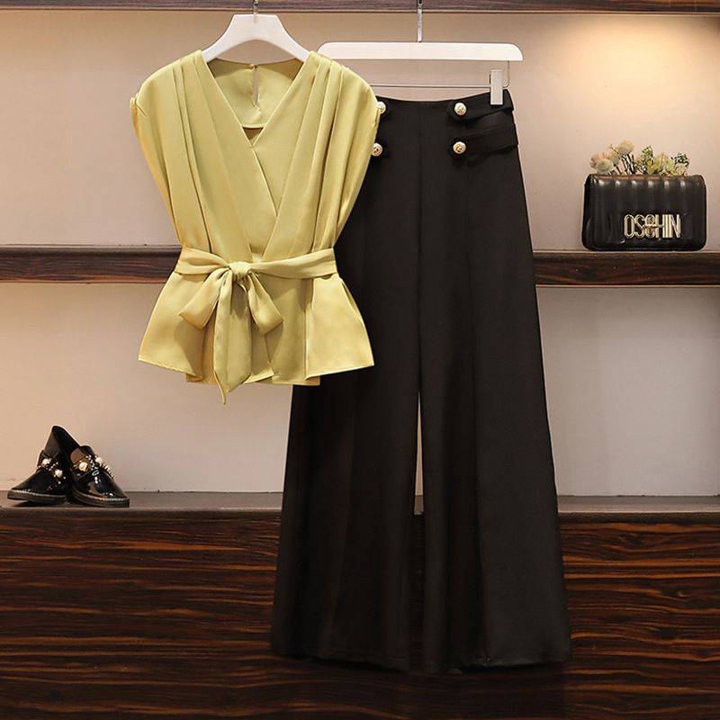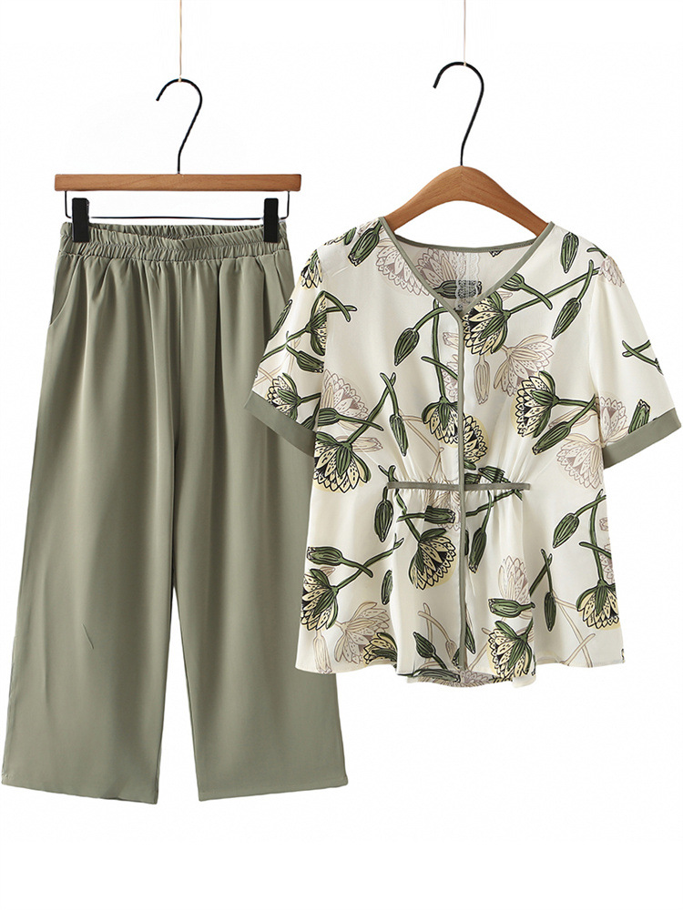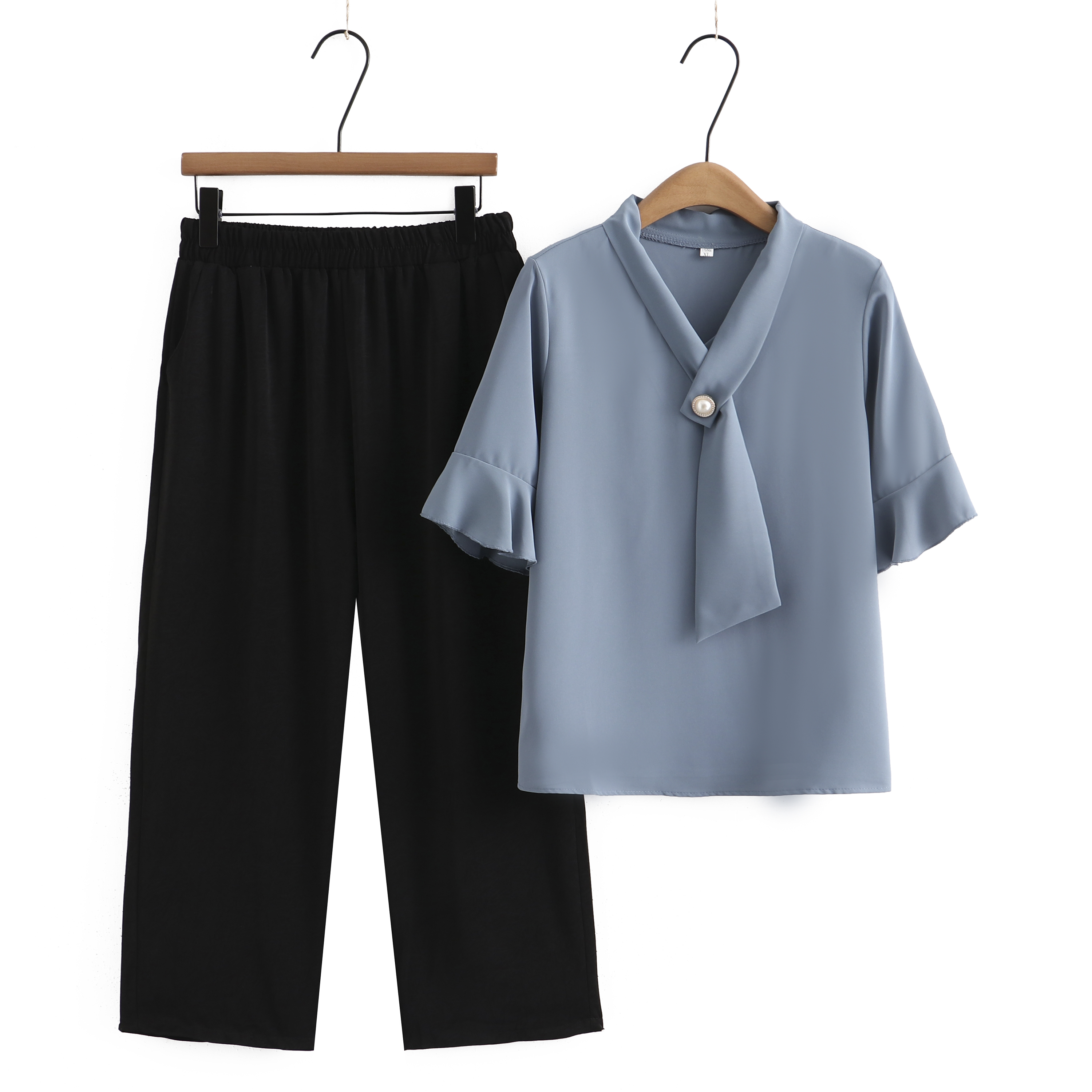中年大きいサイズの女性の夏の新しいママツーピース V ネックトップハイウエストワイドレッグパンツルーズパンツスーツ