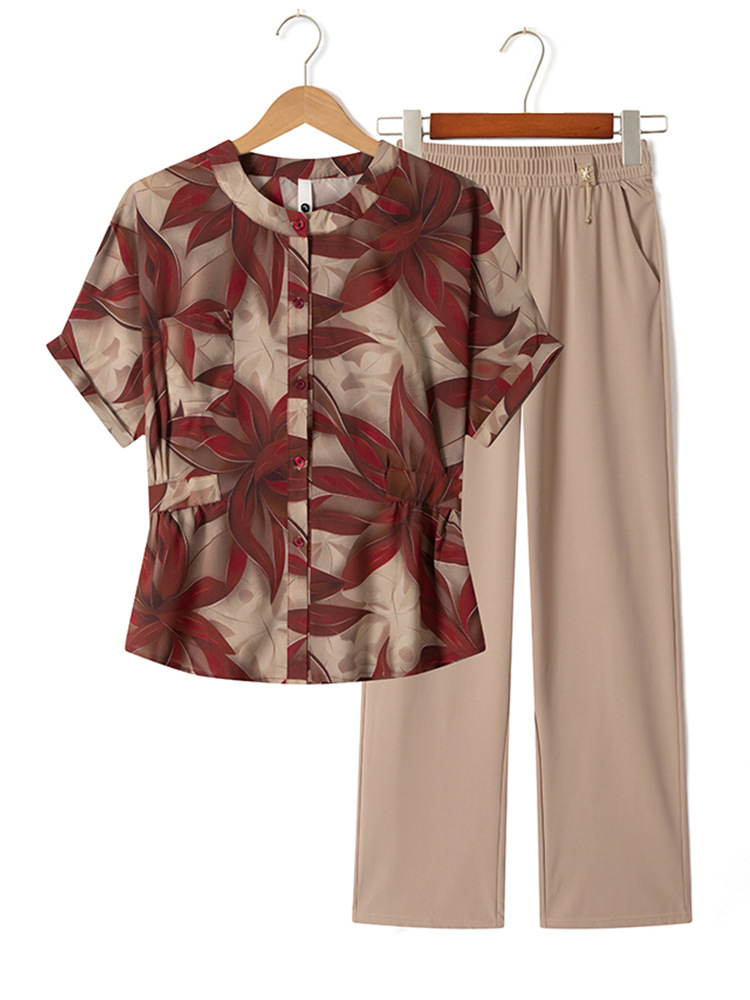 トップス+パンツ 夏 カジュアル クール ママセット イチョウの葉 レッド イチョウの葉 グリーン
