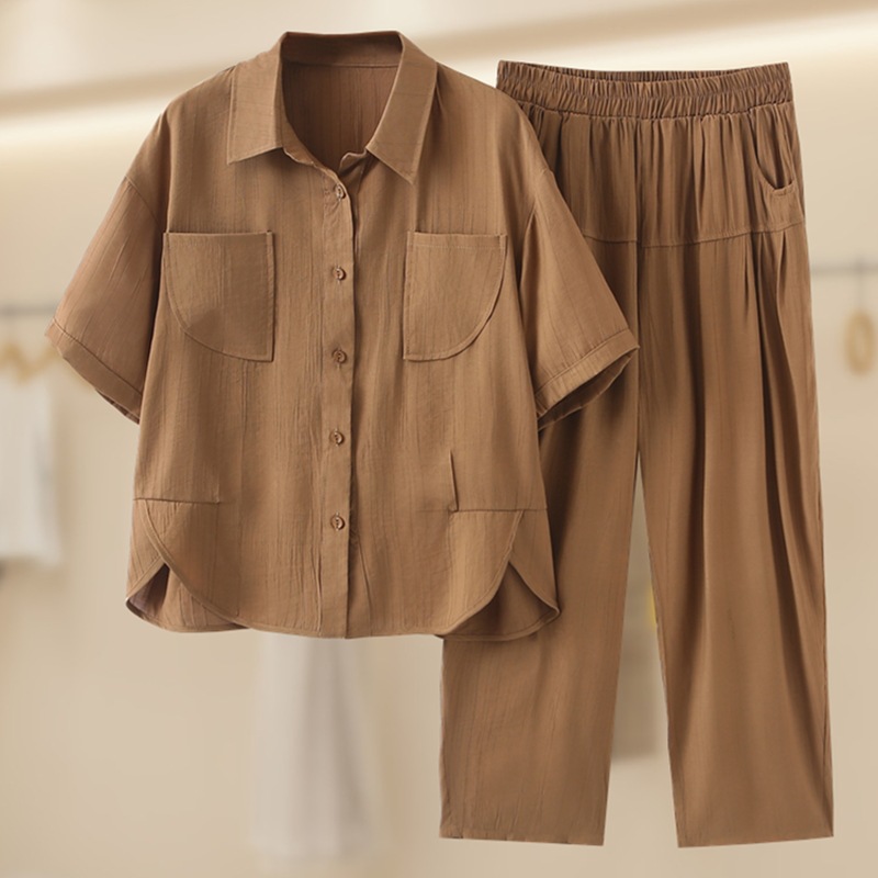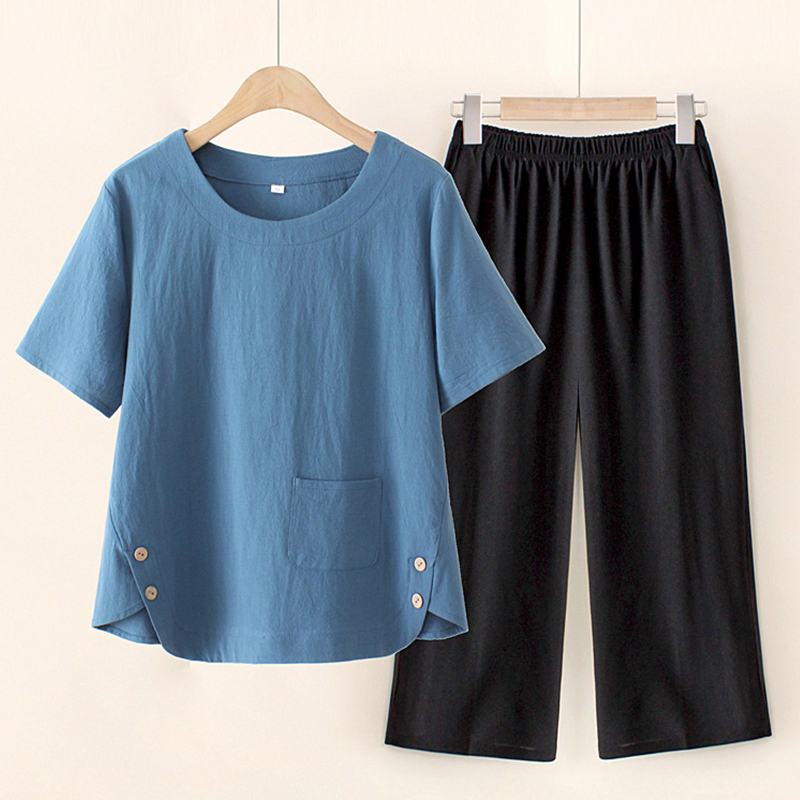 中高年太ったお母さんの夏用半袖シャツスーツ、おしゃれなゆったりプラスサイズ痩身綿麻トップス2点セット
