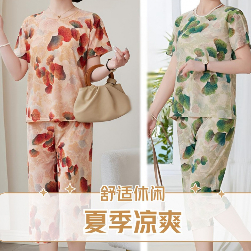 若い母親の夏の新しいスタイルのアイスシルク半袖Tシャツ2025新しい中高年女性の母の日の服2点セット