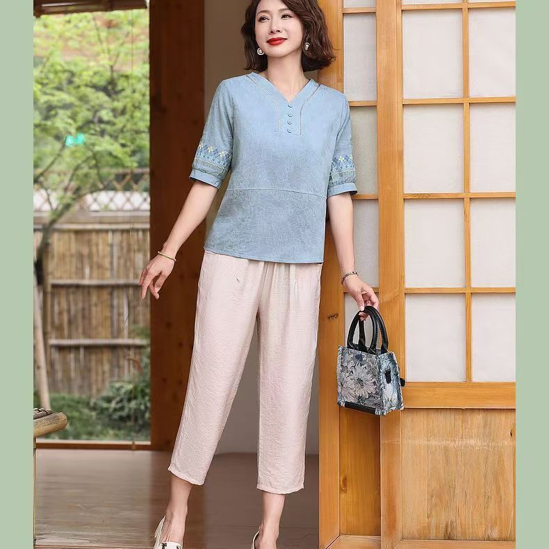 ママの夏スーツ、中高年女性のファッショナブルな綿麻刺繍シャツ、おばさん夏服