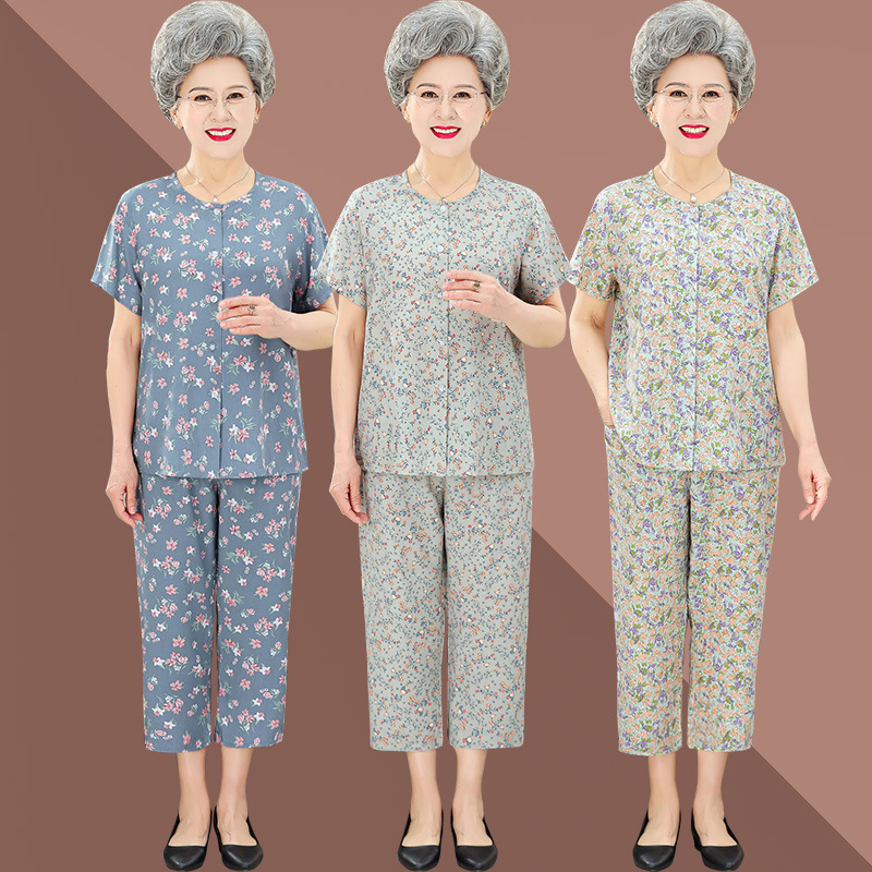 中高年女性の夏服、おばあちゃんの綿絹スーツ、60歳、70歳のお母さんの半袖人工綿老婦人服