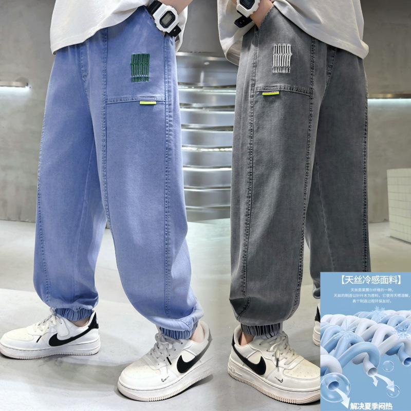 店舗で最も売れている夏の新しい子供用日焼け止め、中型および大型の子供用テンセルソフトデニム通気性のある防蚊パンツ、ハンサムでトレンディです。