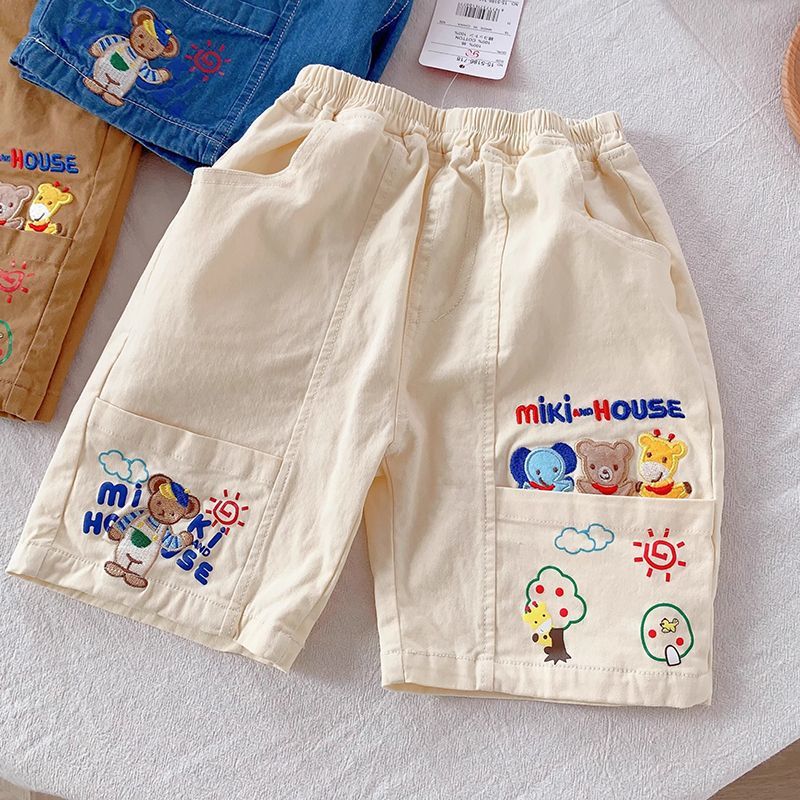 新しい見栄えの良い夏用の男の子と女の子向けの小中型子供用ショーツ、綿織りのクマの刺繍入り5点パンツ、多用途でスタイリッシュです。