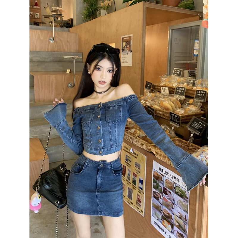 2024秋冬新作 レトロクロスボーダー レディース フレンチレトロ デニムトップス+ベルベットスカートセット