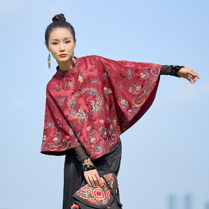 新型女装民族風刺繍立襟唐装百合超痩せサテン刺繍マント多目的マント