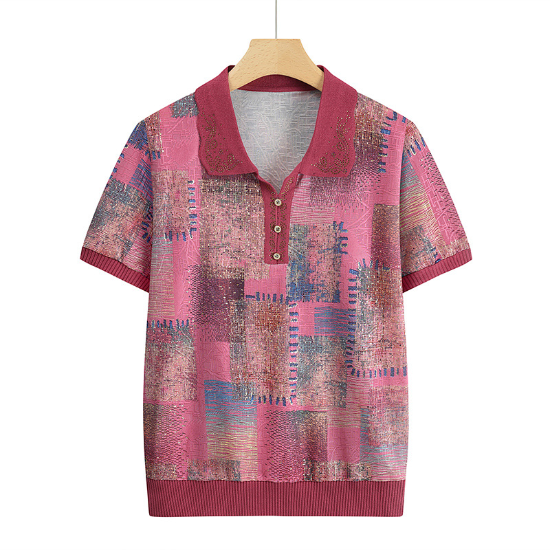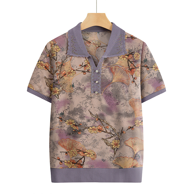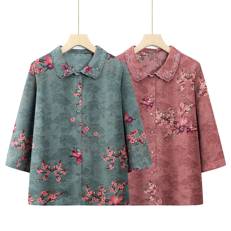 襟をひっくり返してお母さんの服の新型のプリントの半袖の中で年配の女性のタイプの40歳の夏のゆったりしているカジュアルで快適なシャツの服