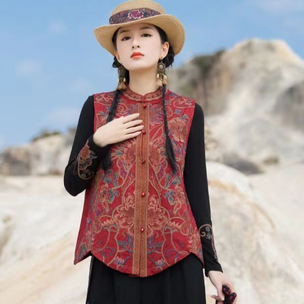 民族風女装重工は刺繍馬を挟んで女性の新しいジャカード錦織刺繍馬甲の袖なしベストコートを着ている