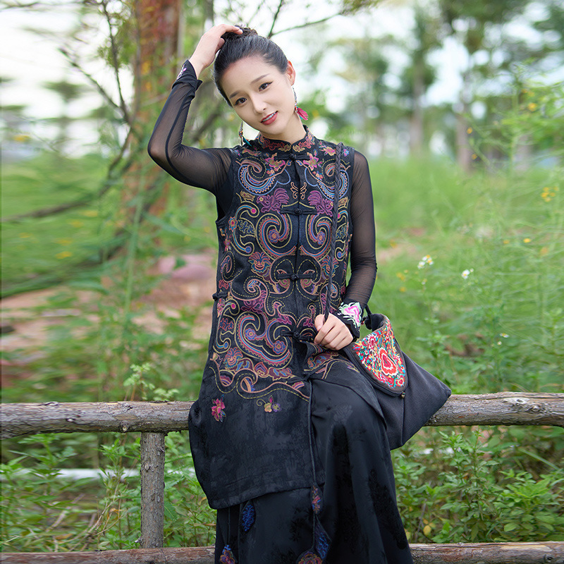新商品の婦人服の民族風の立襟の刺繍は中の長さの袖なしのコートの馬の挟みの立襟の盤は刺繍の馬の甲を掛けます。