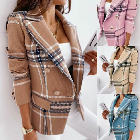 欧米の外国貿易の婦人服の2024春秋の新型の長袖のダブルボタンの格子のプリントのスーツのショートコートの女性