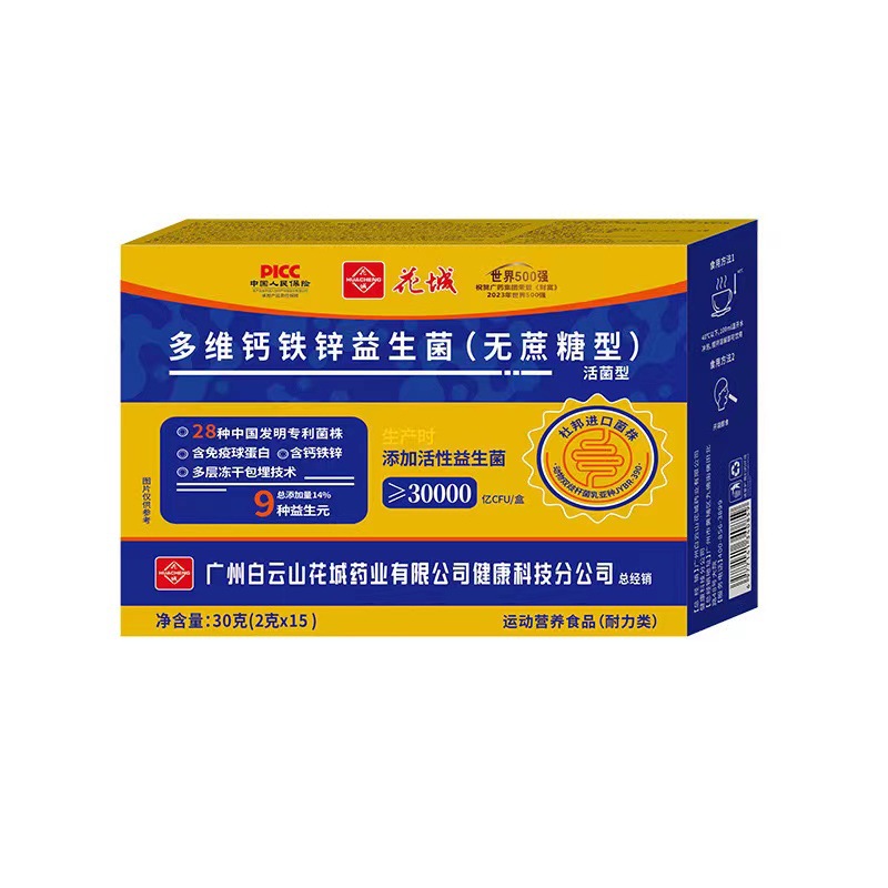 広州白雲山花城多次元カルシウム鉄亜鉛中高年無砂糖型2g * 15袋に活性プロバイオティクスを添加した