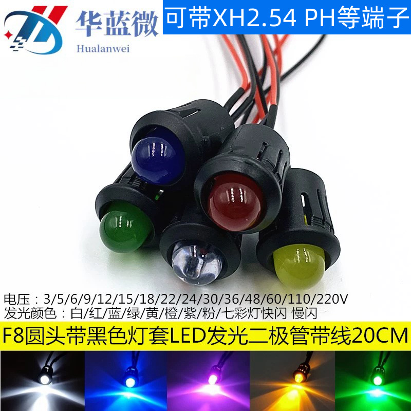 8mm超ハイライトled発光ダイオード3v 5v 6v 12v黒ランプセット穴開け12mm線20センチ