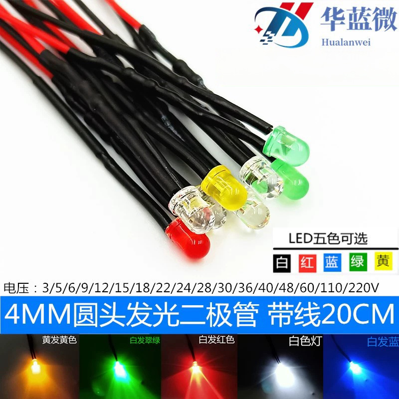 円頭4mm発光ダイオードf4弾丸led信号表示灯3v 5v 9v 12v線20センチ