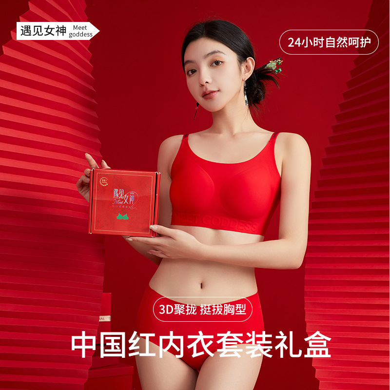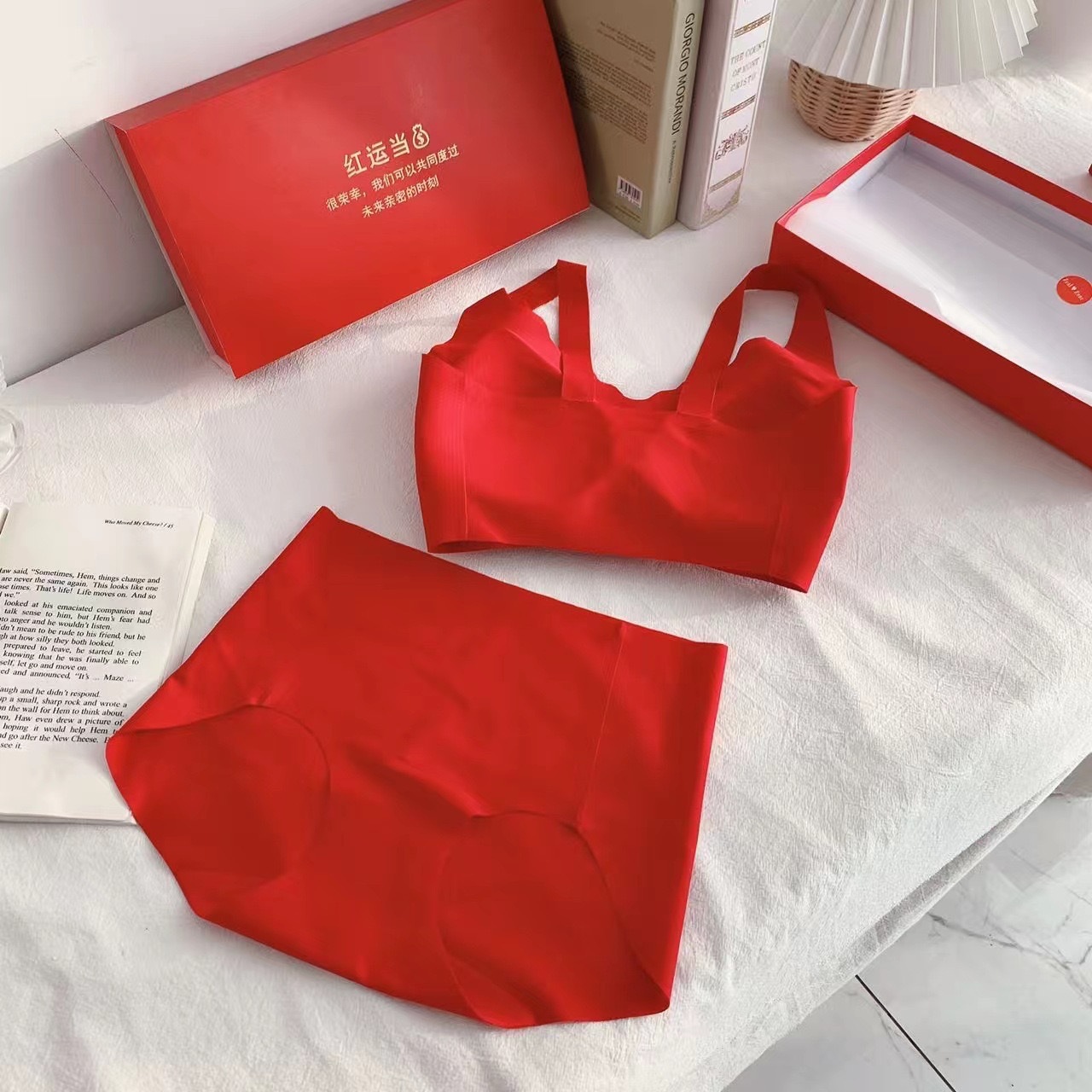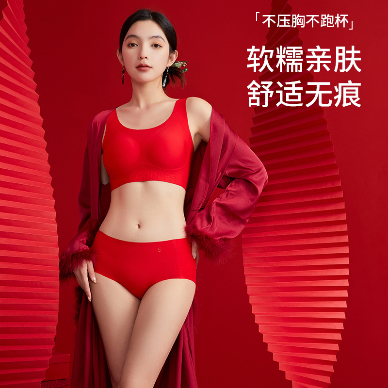 本命年大紅ブラジャーセット快適無痕無鋼輪女性ゼリー条ソフトサポート下着ケース