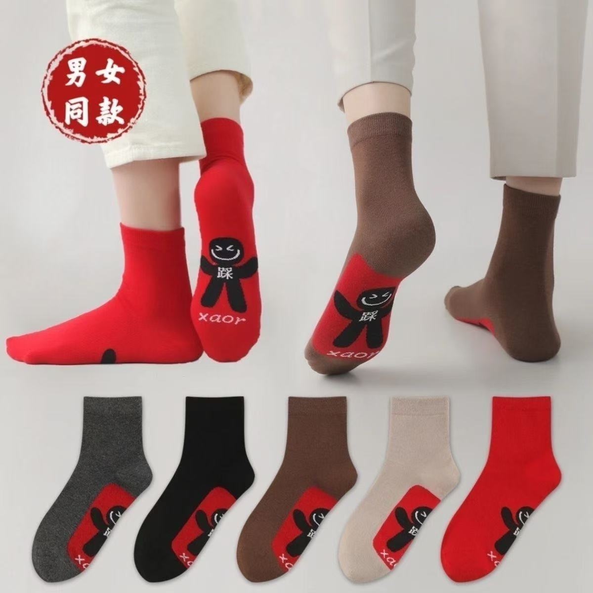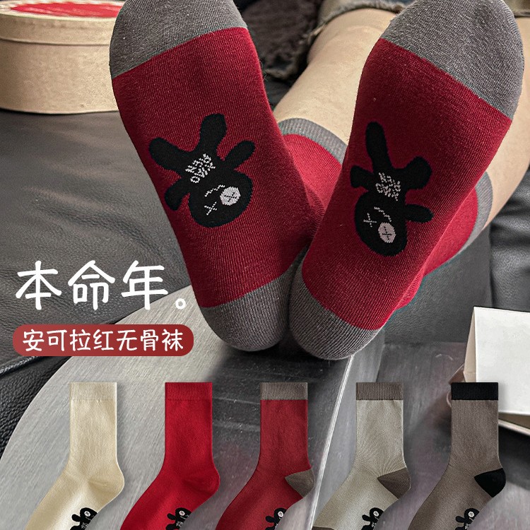 本命年秋冬紅靴下男女カップルの新型中筒小人新年靴下大紅ファッション家庭