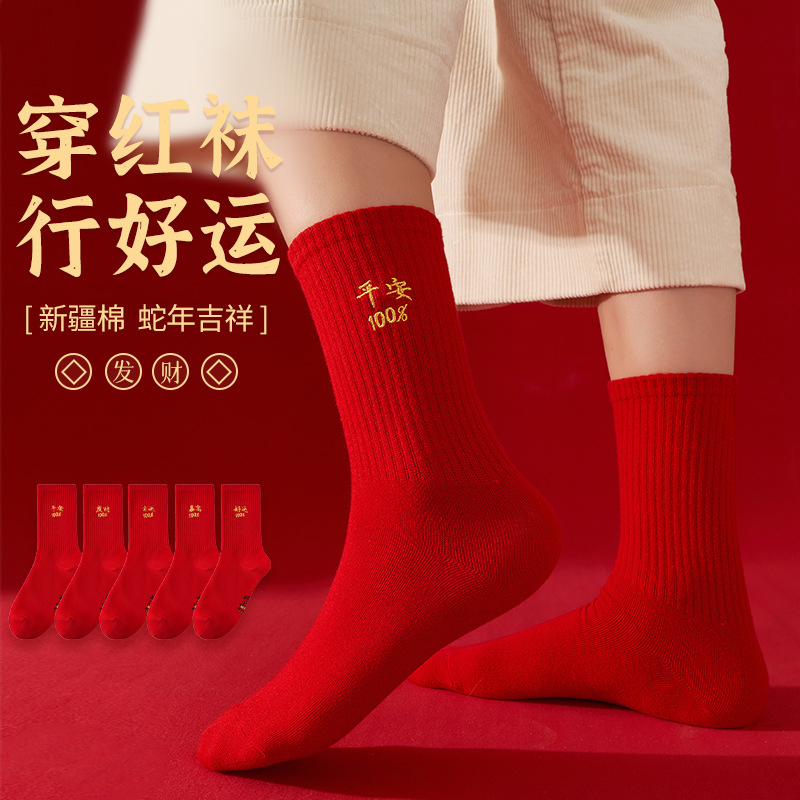 純粋な綿の干支年お祝い赤い靴下男性と女性のカップルロングミッドチューブヘビ年秋と冬スタイル大きな赤い赤い祝福の言葉ロング