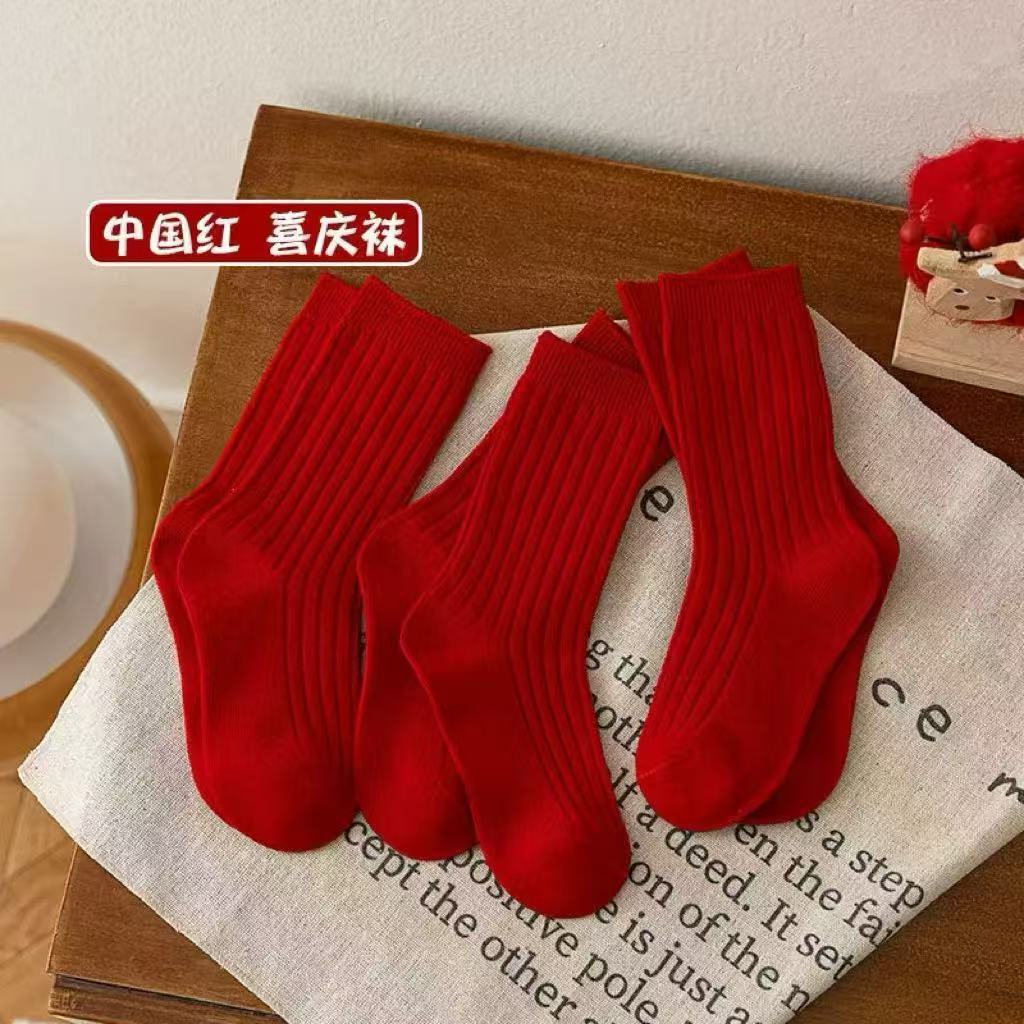 干支年用の赤い靴下 秋冬用 無地 ミドル丈靴下 カップル靴下 ハイソックス 男女兼用 幸運靴下 綿靴下