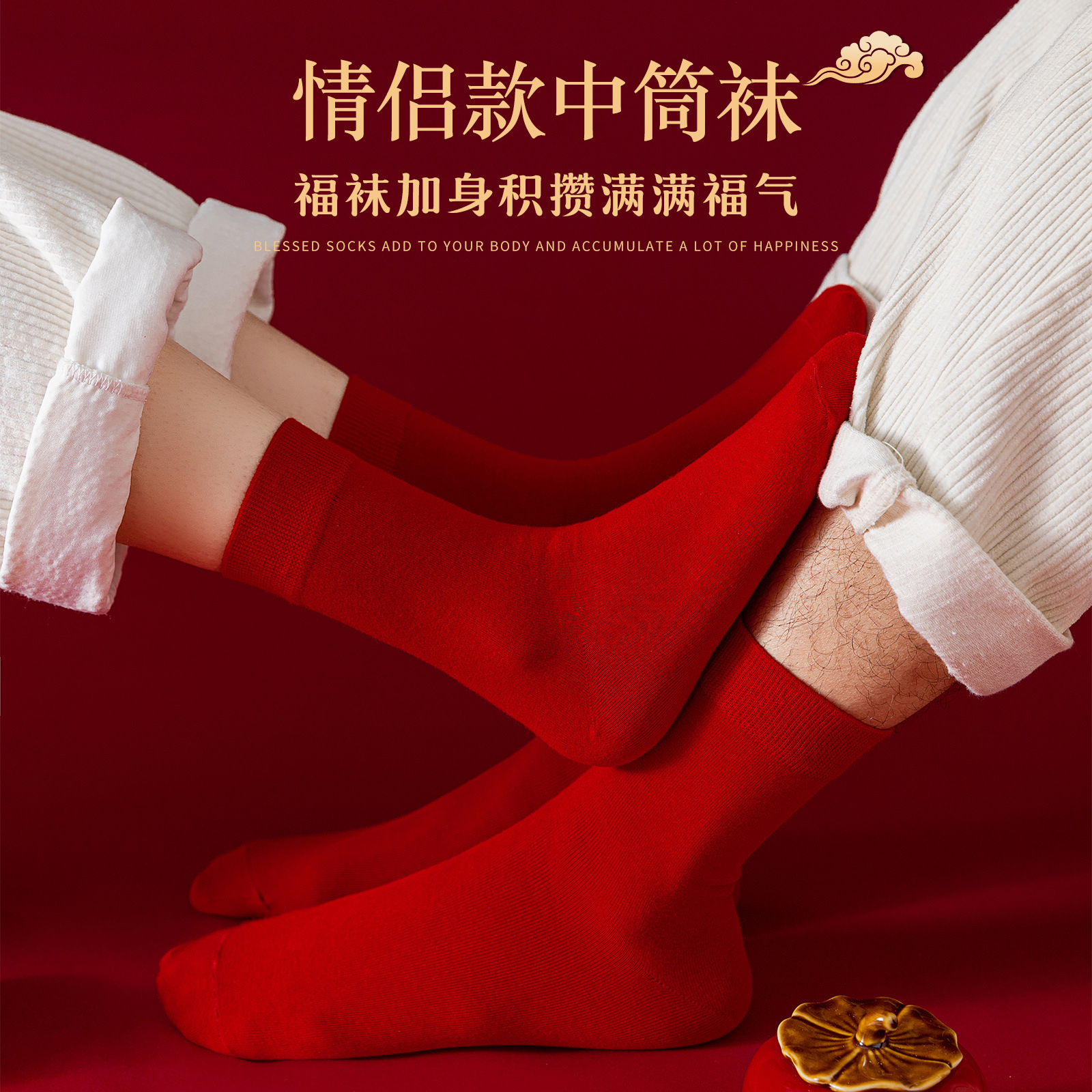 男女兼用秋冬用靴下、純綿、新年用、精梳綿、カップル用、赤い靴下、二本針、無骨縫製、中丈、本命年用
