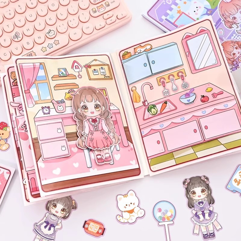 静かな本diyシーンは、手作りのシールをトリミングしないで、子供の着せ替えおもちゃを包むかわいい少女