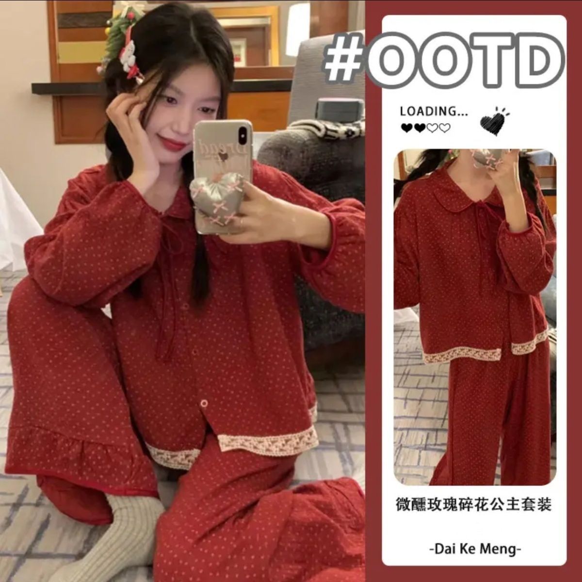 赤い結婚パジャマ女性春と秋の純綿長袖プリンセス風ホームウェア本命年新婚純綿セット