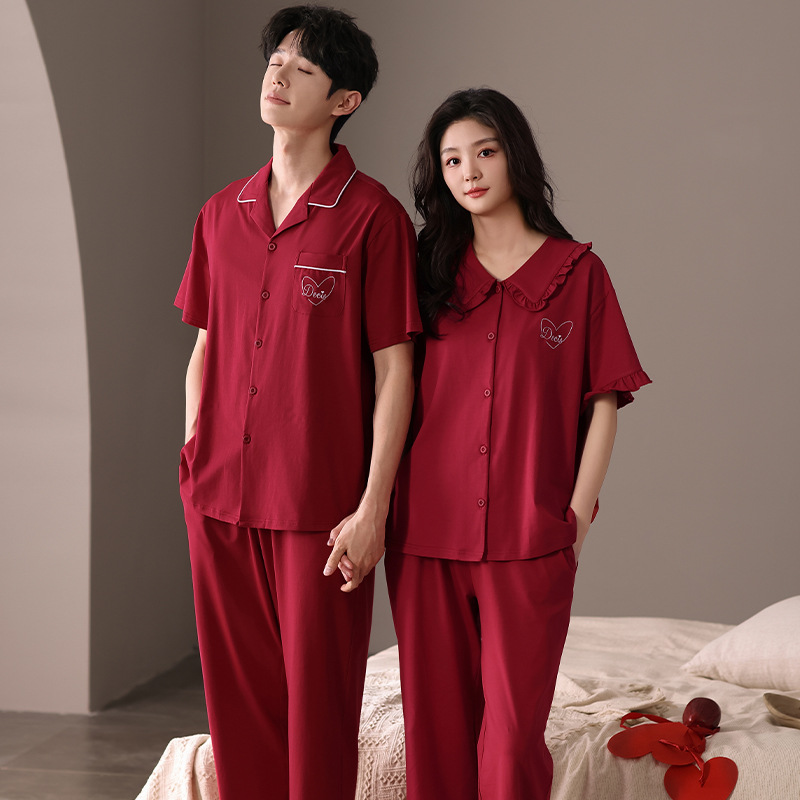 赤いカップルのパジャマ純綿半袖結婚新婚新人夏のお祝い本命年ホームウェア男女セット