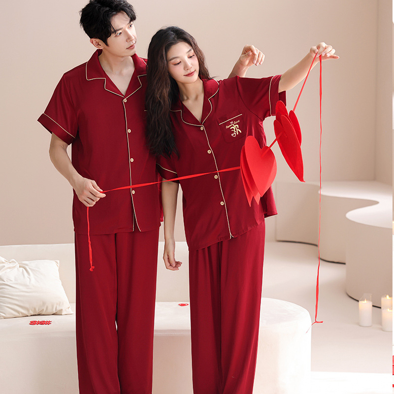 カップルパジャマ夏のアイスシルク半袖ズボン新婚結婚式お祝い赤薄いホーム服男性と女性の夏のスーツ